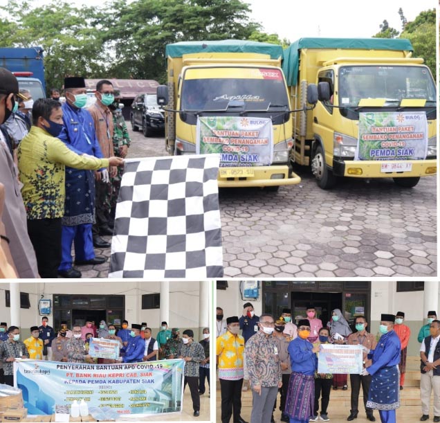 Dalam kesempatan ini, Pimpinan Bank Riau Kepri menyerahkan kepada Bupati Siak Alfedri bantuan berupa Alat Perlindung Diri (APD), dan Bantuan Aksi Peduli Pegawai Bank Riau Kepri Cabang Siak untuk Gugus Tugas Covid-19 sebesar Rp.20 juta rupiah.