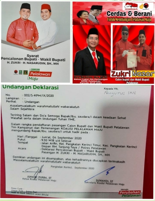 Dalam isi surat undangan tersebut, Junaidi Purba, meminta seluruh relawan pemenangan pasangan Zukri-Nazar agar dapat bersama Tim Kampanye dan pemenangan "Koalisi Pelalawan Maju" menghadiri dan menyaksikan acara Deklarasi pencalonan Bupati H.Zukri Misran dan pencalonan Wakil Bupati Pelalawan H.Nazaruddin,SH,MH.