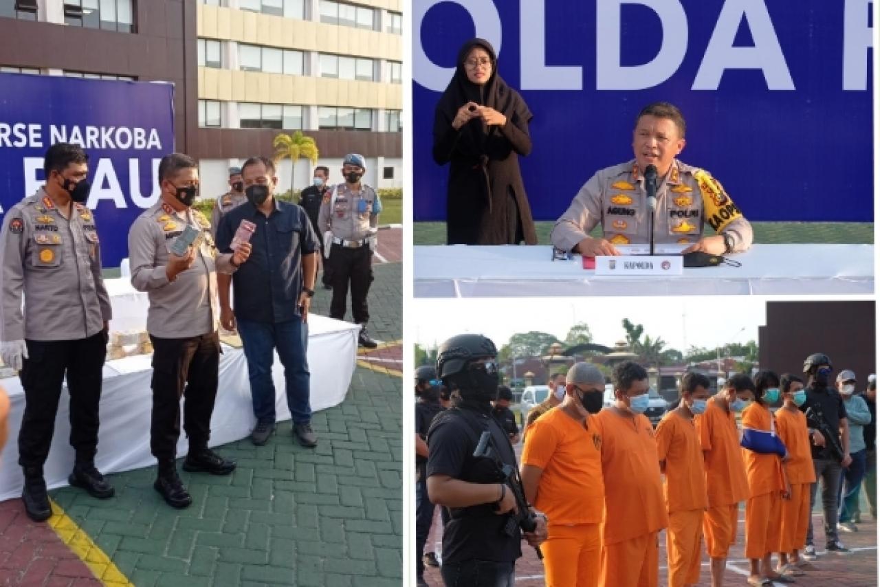 PEKANBARU, Ungkapriau.com- Kapolda Riau, Irjen Pol Agung Setya Imam Efendi SH, SIK, MSI mengatakan, bahwa pihaknya sudah memetakan dan akan melanjutkan secara serius pemburuan para pelaku narkoba di wilayah Riau, yang memang terhubung dengan sindikat narkoba Internasional. Hal tersebut disampaikan Irjen Agung di halaman parkir Mapolda Riau saat menggelar Konperensi Pers, Selasa sore (06/04/2021).