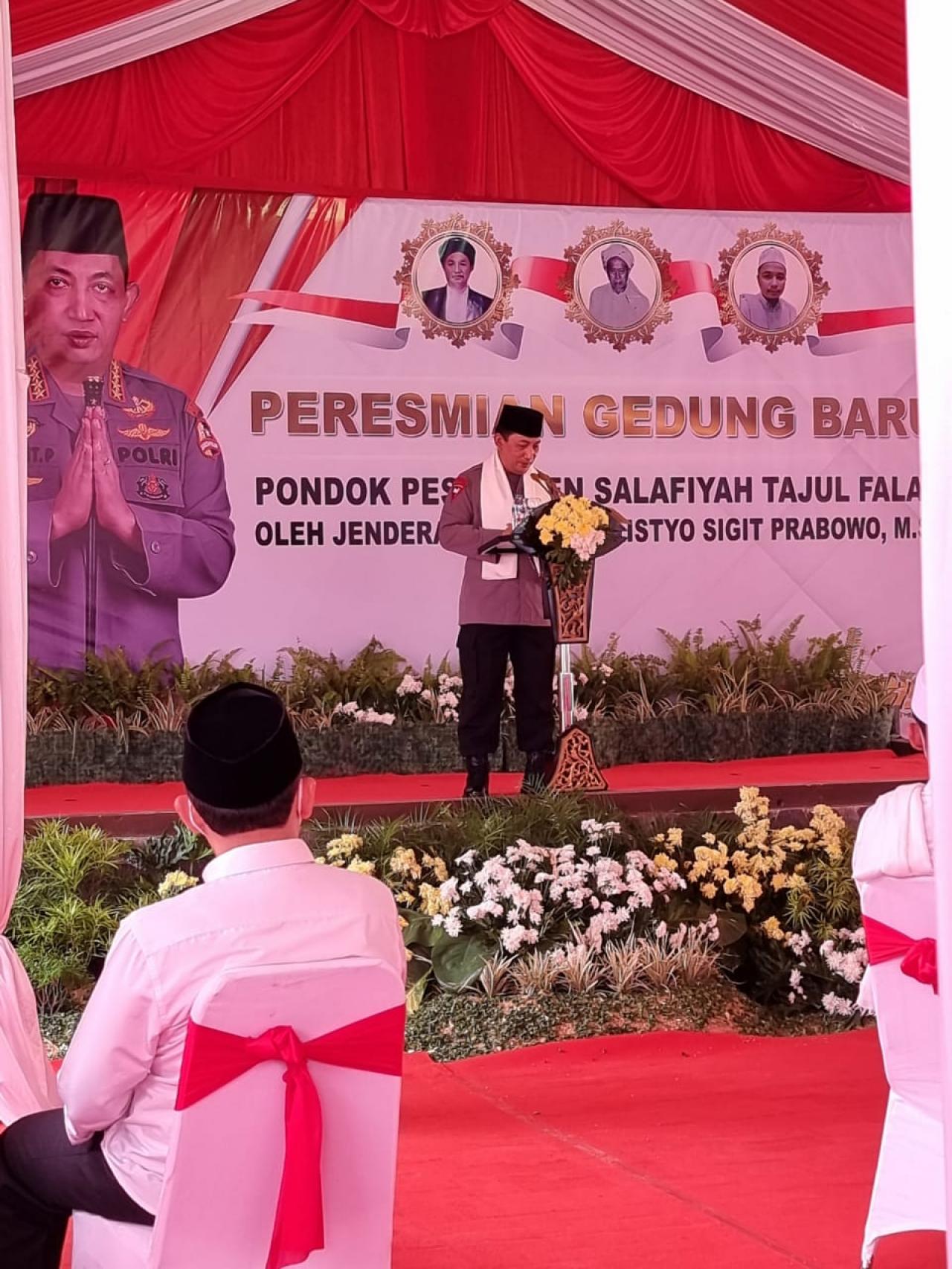 Adapun bangunan yang diresmikan Kapolri ini merupakan sebuah gedung tiga lantai yang akan digunakan untuk keperluan Pondok Pesantren Salafiyah Tajul Falah.