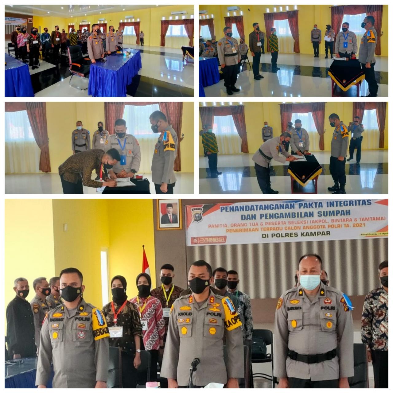 KAMPAR, Ungkapriau.com- Panitia Seleksi dan Peserta Calon Anggota Polri Penerimaan Tahun Anggaran 2021, melaksanakan Penandatanganan Pakta Integritas dan Pengambilan Sumpah terhadap Panitia, Selasa (13/04/2021).