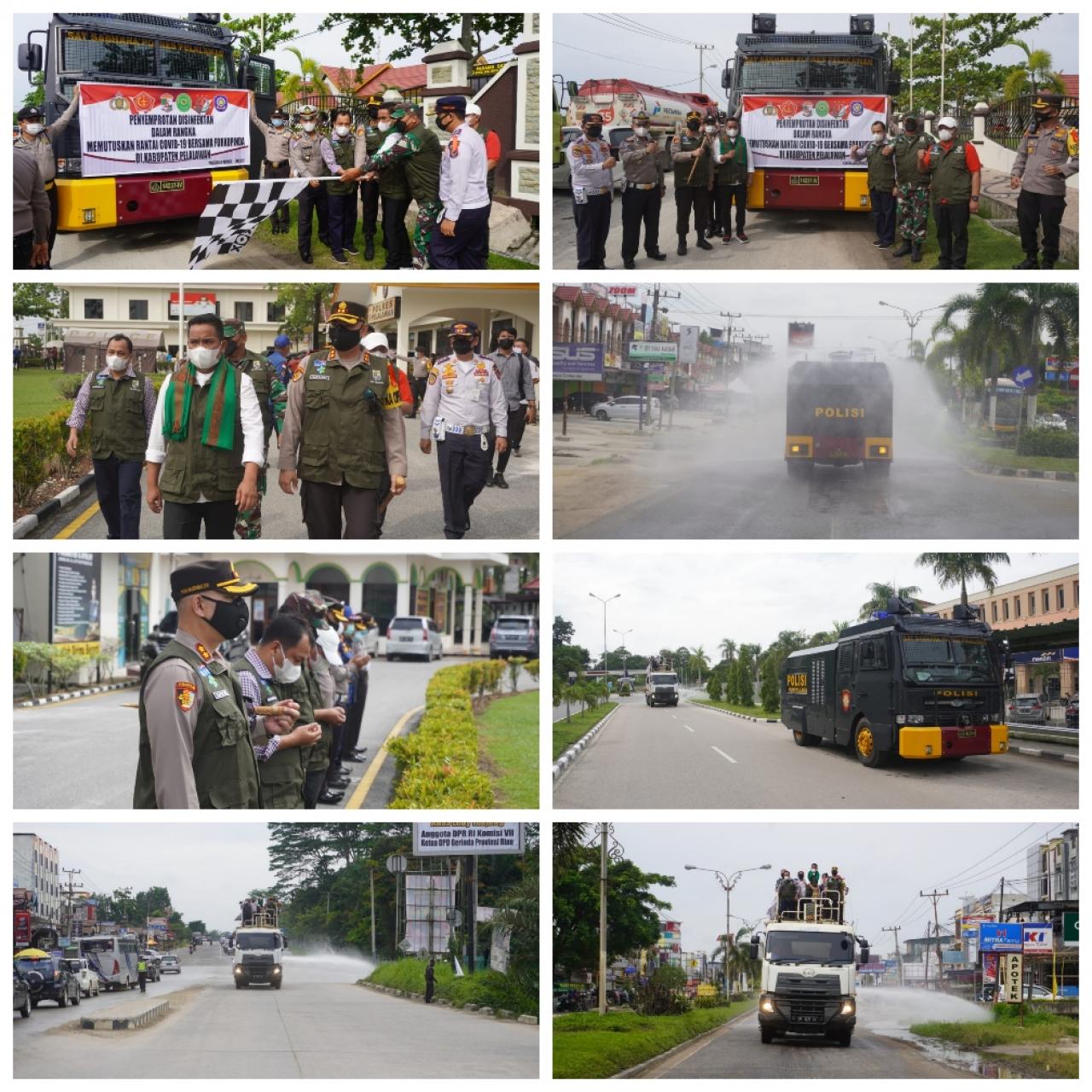 Adapun rangkaian kegiatan seperti Apel Kesiapan yang dipimpin oleh Bupati Pelalawan H Zukri Misran, Pelepasan Ranmor Penyemprotan dipimpin oleh Kapolres Pelalawan AKBP Indra Wijatmiko,S.Ik didampingi oleh Bupati Pelalawan, H. Zukri Misran (serta para Forkopimda Kab. Pelalawan dgn menggunakan Kendaraan Penyemprotan yang terdiri dari 1 Unit Mobil Water Canon Sat Sabhara, 1 Unit Mobil Damkar Kab. Pelalawan, 1 Unit Truk Tanki BPBD Kab. Pelalawan, 1 Unit Mobil Watertank PT. RAPP.