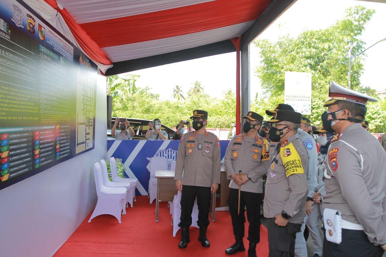 Didampingi Kapolda Riau Irjen Agung Setia dan Dirlantas Kombes Firman Darmansyah, Kakorlantas menerima penjelasan dari Wadirlantas AKBP Donni Eka Syaputra tentang kegiatan penyekatan yang dilakukan Polda Riau termasuk jajaran Direktorat Lalulintas bersama stake holder dalam rangka penerapan PPKM level 4 di Pekanbaru dan beberapa wilayah kabupaten.