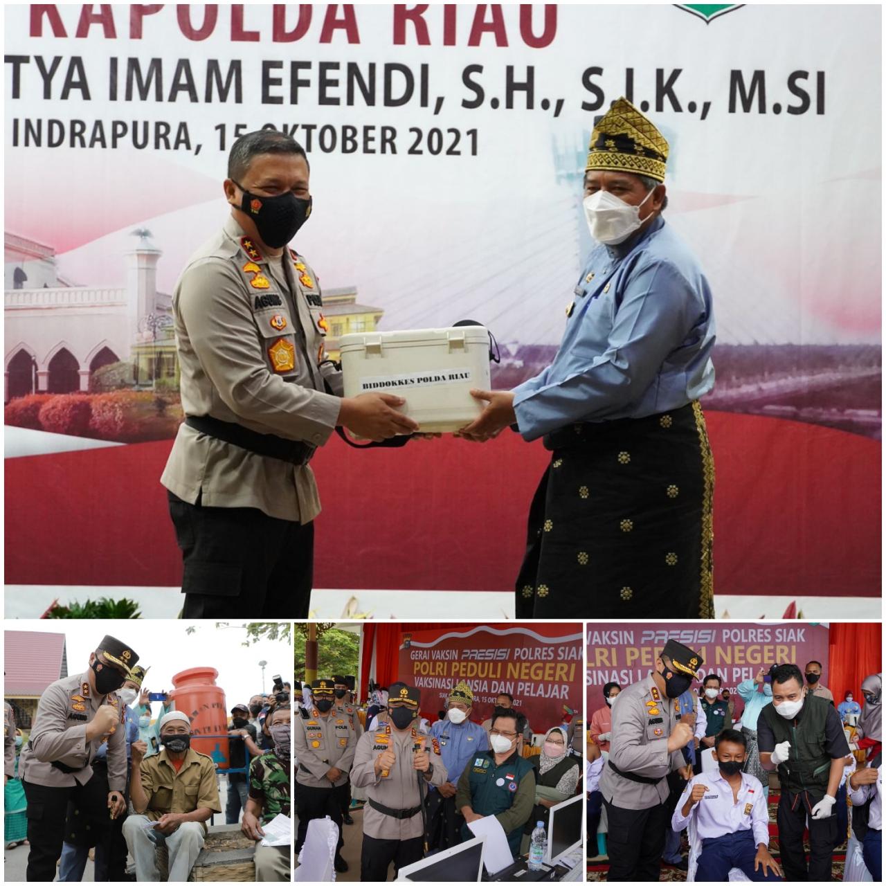 Selain itu, Kapolda Riau juga menyerahkan sebanyak 500 dosis Vaksin covid-19 yang diterima oleh Bupati Siak yang dipergunakan pada kegiatan pelaksanaan vaksinasi massal di lapangan Maharatu bagi lansia dan anak sekolah.