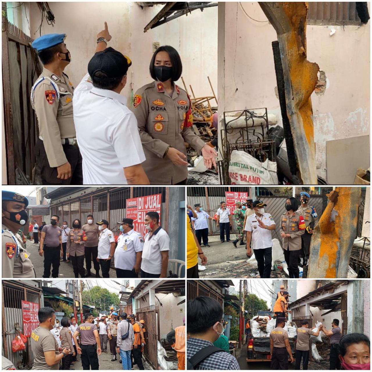Tanjung Duren - Kepolisian Sektor (Polsek) Tanjung Duren bersama tiga pilar melaksanakan apel kerja bhakti membersihkan puing-puing di area pascakebakaran yang terjadi di Jl.Makaliwe II Gg. 3 Rt. 03/08 dan Gg 4 Rt. 04/08 Kel. Grogol Jakarta Barat, Rabu (27/10/2021).
