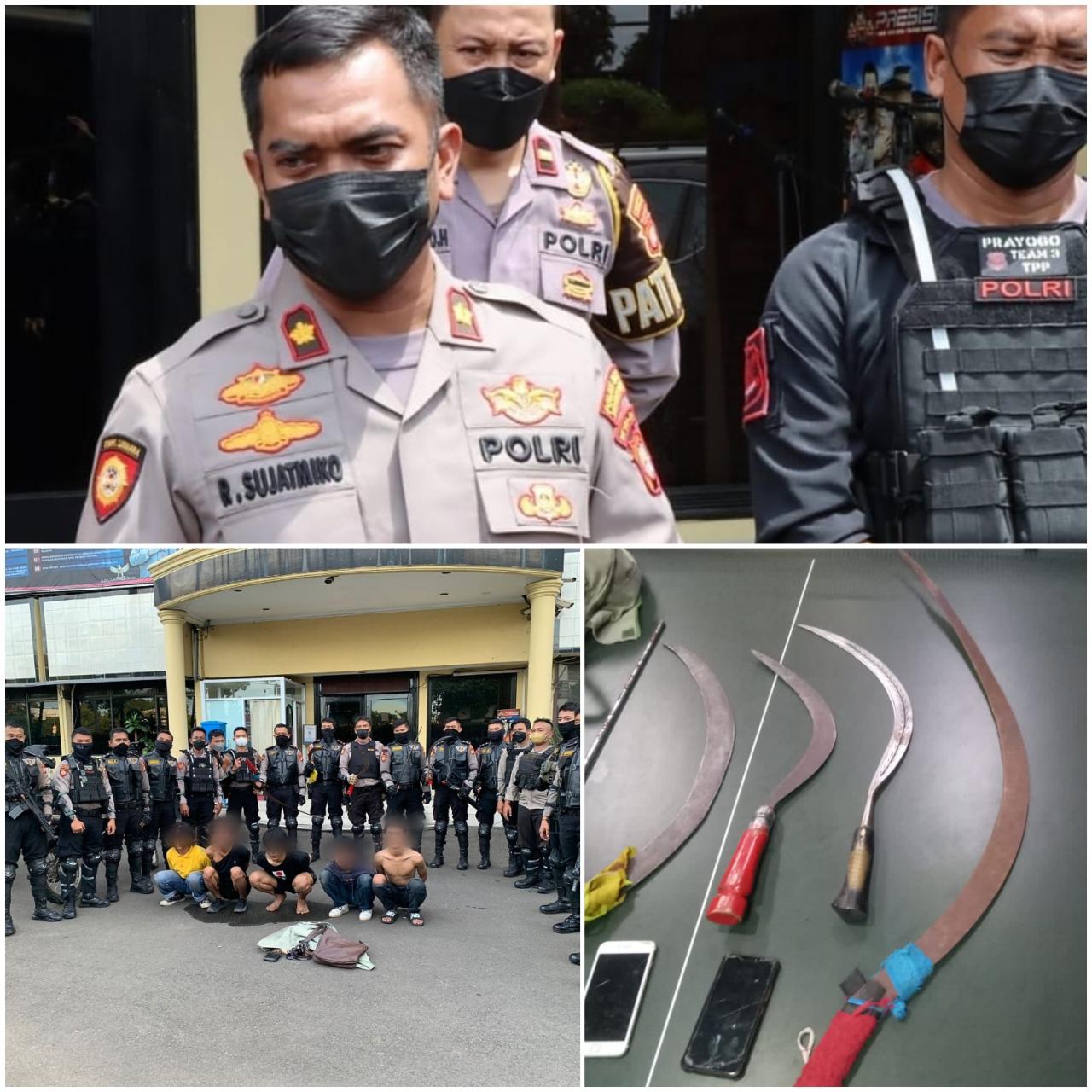 "5 orang pemuda berhasil kami amankan berikut berbagai senjata tajam diantaranya 4 buah senjata tajam jenis celurit, 1 buah samurai," kata rahmad