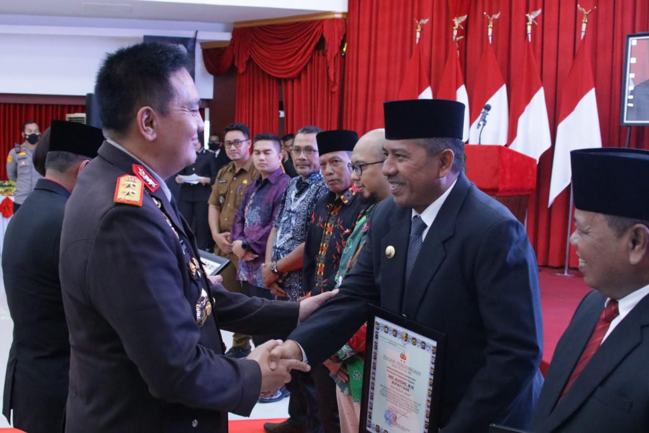 PEKANBARU (ungkapriau.com) - Bupati Siak Alfedri pada puncak peringatan HUT Bhayangkara ke-76 yang berlangsung di aula Tribata Polda Riau Jalan Patimura Pekanbaru, menerima penghargaan dari Kapolda Riau penghargaan itu di serahkan langsung Wakil Gubernur Riau Edy Natar Nasution.