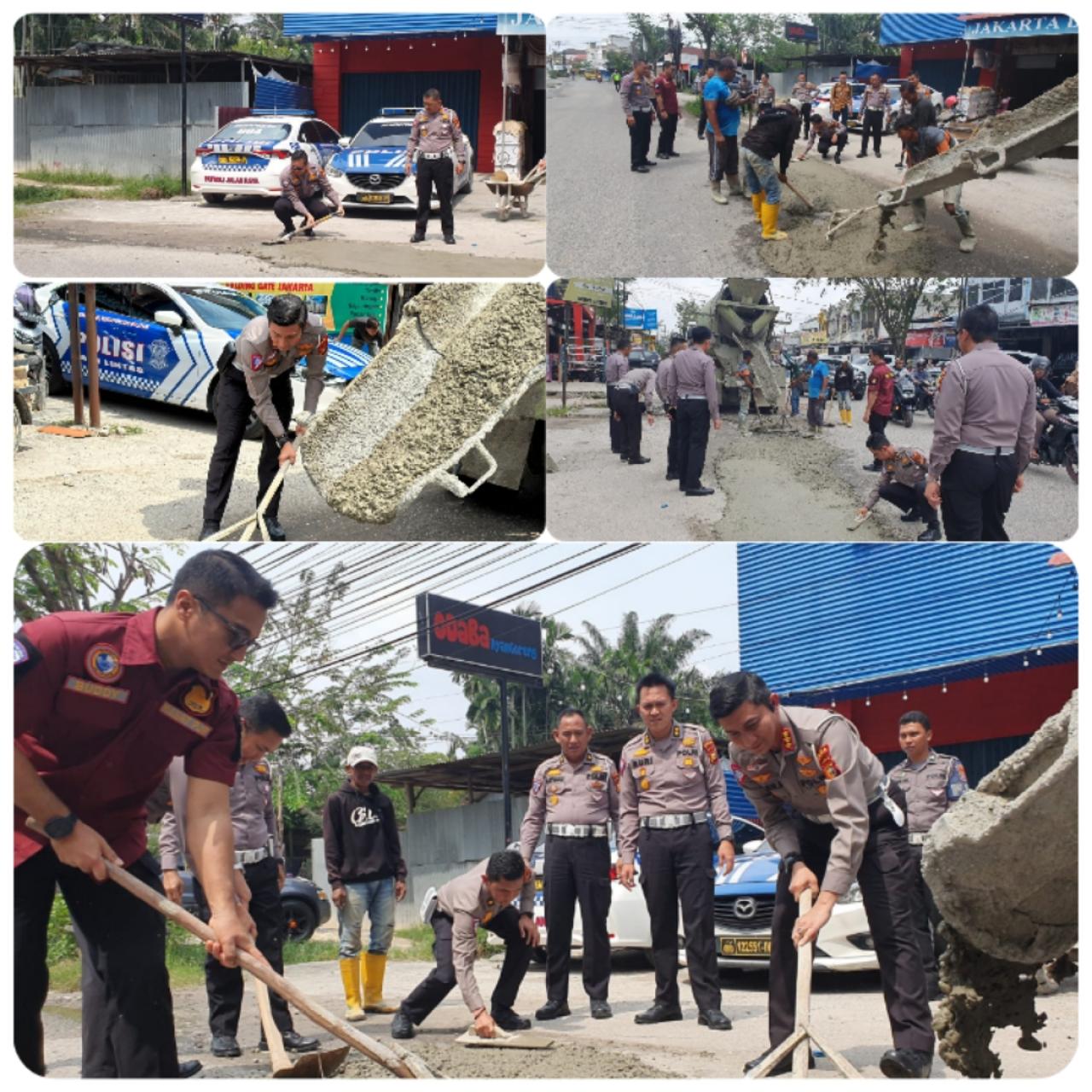 Kombes Pol Dwi Nur Setiawan, S.Ik, MH, didampingi PJU Ditlantas Polda Riau, menyisir titik Lobang di sepanjang Jln.Paus untuk di Cor dengan menggunakan Ready Mic sebagai bentuk kepedulian keselamatan para pengendara kendaraan bermotor.
