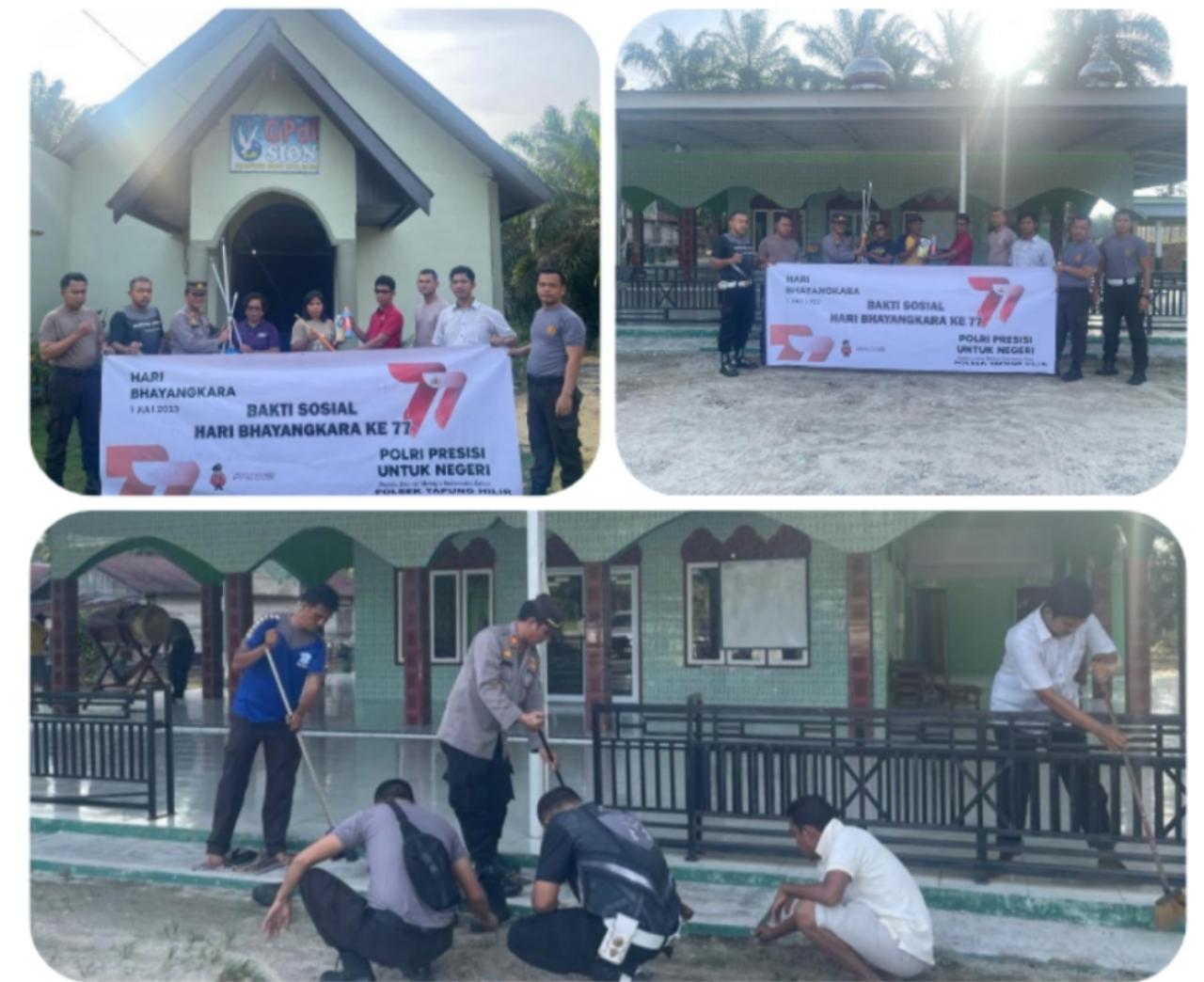 Kampar (ungkapriau.com)- Dalam rangka menyambut HUT Bhayangkara ke 77 pada tanggal 01 Juli 2023, Polsek Tapung Hilir melaksanakan kegiatan bakti sosial dalam bentuk gotong royong di 2 tempat ibadah yaitu di Masjid Nurul Iman dan Gereja GPDI Sion Desa Kota Garo Kecamatan Tapung Hilir, Jum'at (09/06/2023).