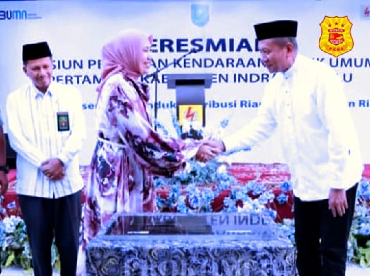 Bupati Indragiri Hulu, Rezita Meylani Yopi SE, meresmikan SPKLU yang pertama ada di Kabupaten Inhu, di halaman Kantor PLN UP3 Rengat Jalan Lintas Timur Kelurahan Pematang Reba Kecamatan Rengat Barat Kabupaten Inhu, Kamis (28/3/2024).