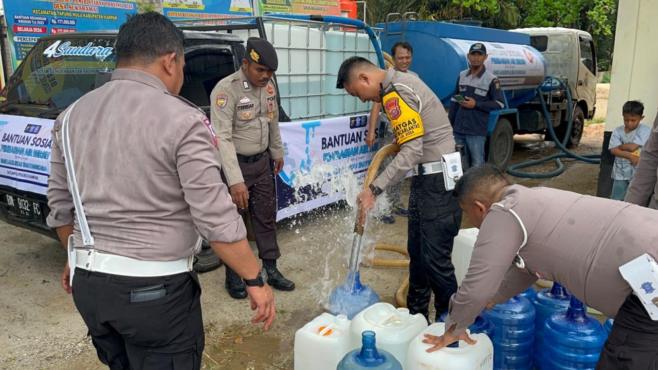 "Bakti sosial ini kita membantu masyarakat yang membutuhkan air bersih, terutama tempat-tempat sulit mendapatkan air bersih,"ungkap Kapolres Kampar AKBP Ronald Sumaja melalui Wakapolres Kompol Andi Cakra Putra didampingi Kasat Lantas AKP Vino Lestari.